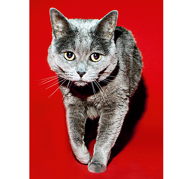 Maro: The cat project was a long time coming — being a subscriber to Cat Fancy at a young age, it was bound to be. It came out of an accidental photo I took of my cat Razzy Starr. I was shooting a model on a red backdrop. and during a break my cat walked on to the backdrop. I grabbed my camera and quickly caught her walking toward me — her expression is priceless. The photograph captures her intensity. She is an extremely sensitive, emotional cat. The use of color is a trademark in my nightlife photography. I thought, Why not make cats just as iconic as the people I photograph? They have distinct personalities, and I wanted to convey that in images that pop. Cats have attitude, after all.