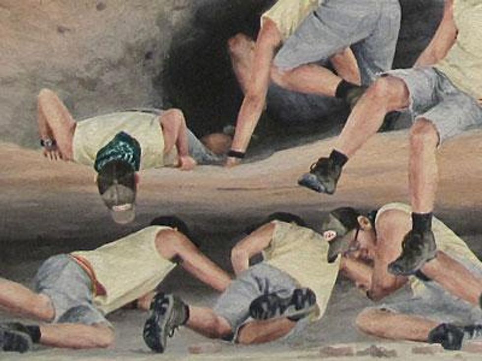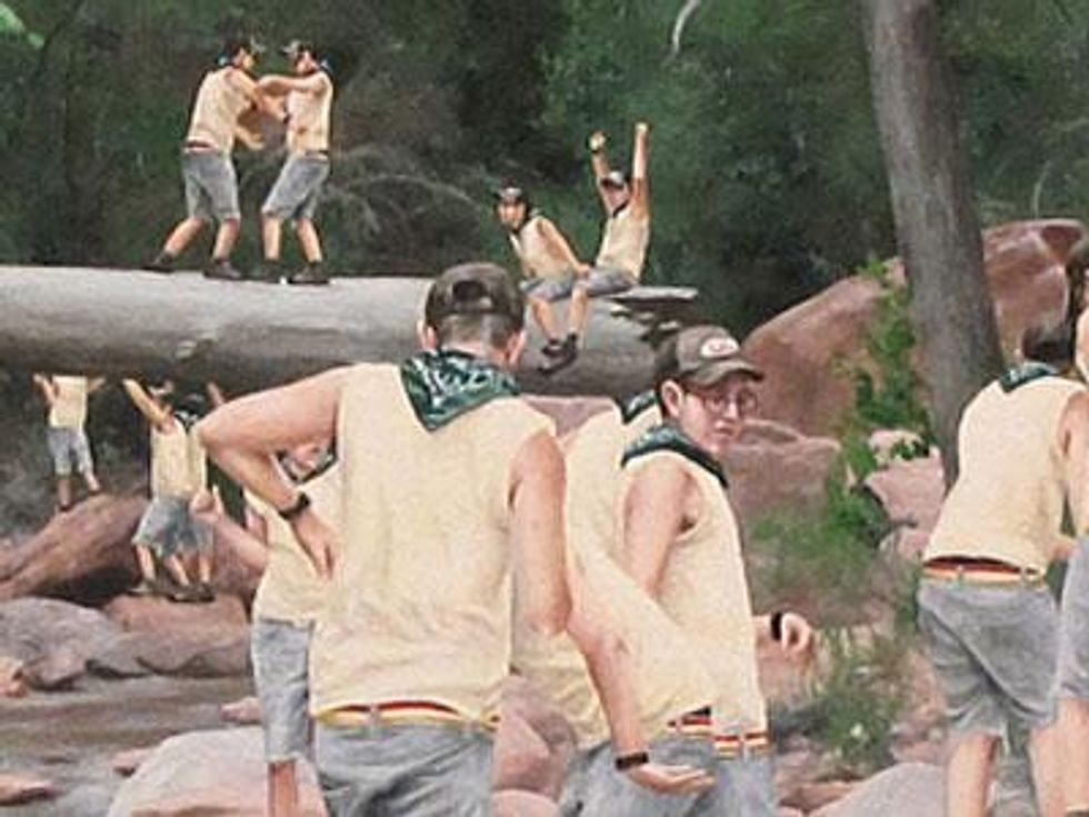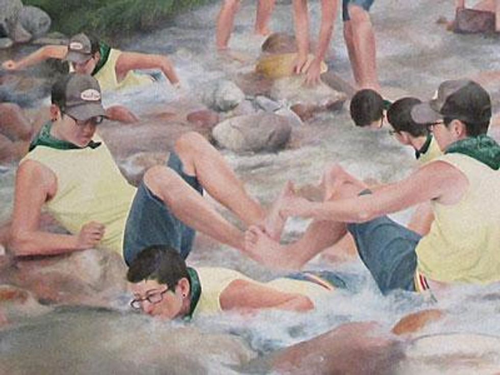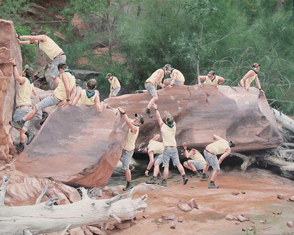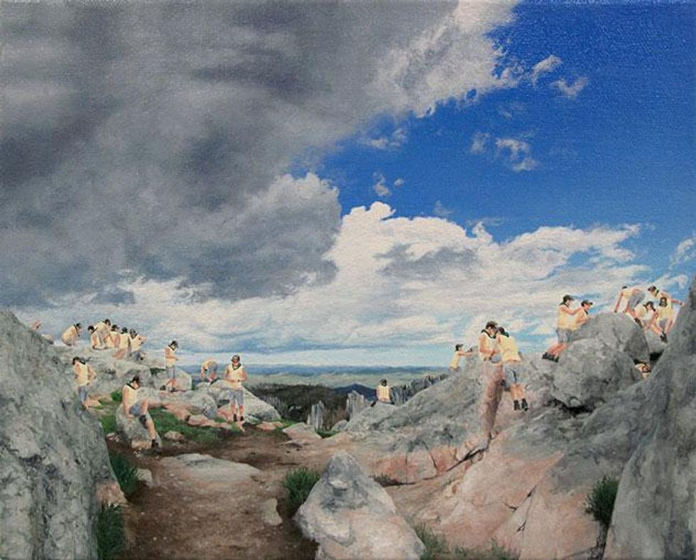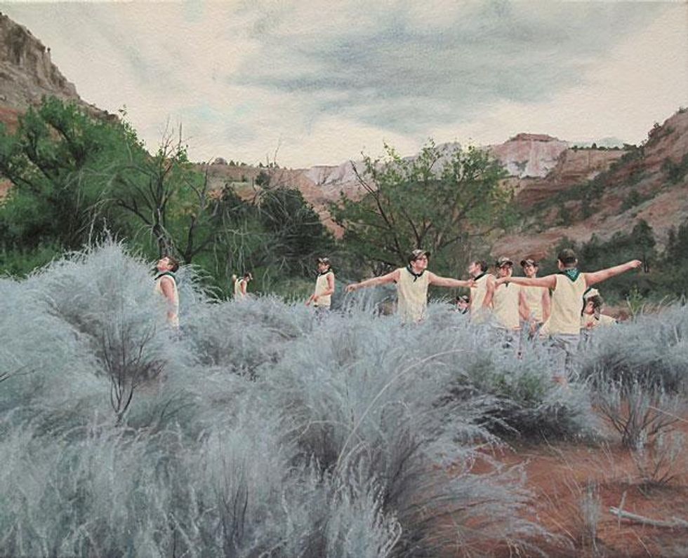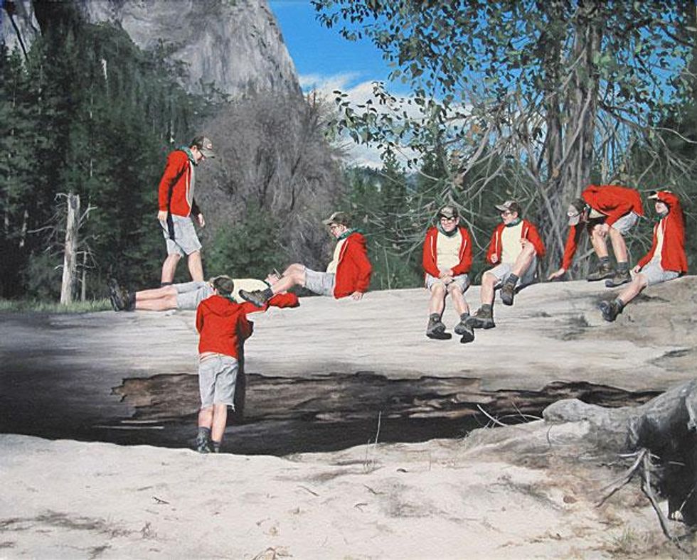 Loosely utilizing the Hudson River School as a visual point of departure, Moules metaphorically utilizes the landscape as a stand-in for his own Christian upbringing. "Bois Just Wanna Have Fun" is a synthesis of wanderlust and raison d'etre, where he creates a fantasy world in which only he exists.