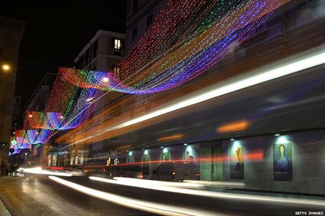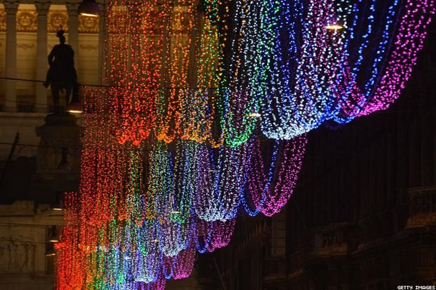 Strands of red, orange, yellow, green, blue, indigo, and violet light up the night sky for nearly a mile in the Via del Corso, spanning from Piazza Venezia to Piazza del Popolo. Agence France-Presse reports that Mayor Ignazio Marino and Assemblywoman Imma Battaglia, who also leads an LGBT rights group, intended to send a message about acceptance in response to public outcry over the suicides of at least three gay Italian teenagers earlier this year.