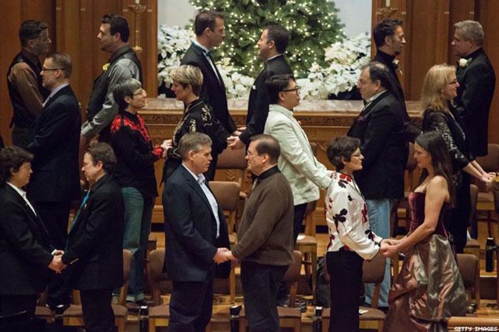 Hundreds of couples were expected to marry throughout the state on Sunday, some in private affairs and others in large public events. Around 140 couples were expected to marry at City Hall in Seattle. Then 25 same-sex partners at Seattle's First Baptist Church exchanged vows during a mass wedding.