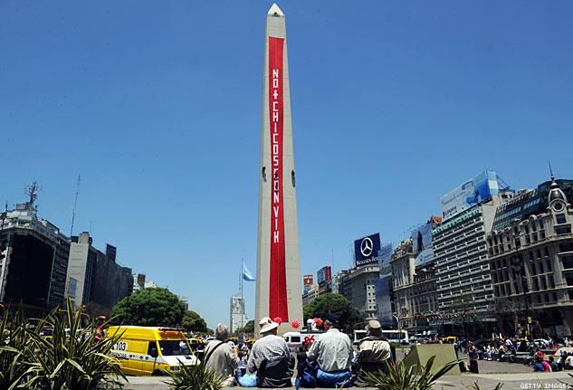 Tourists observe a banner hung on the obelisk with the inscription 'No more kids with HIV', while acrobats perform in the monument, during the commemoration of World AIDS Day, at the Plaza de la Republica, in downtown Buenos Aires on December 1, 2011.