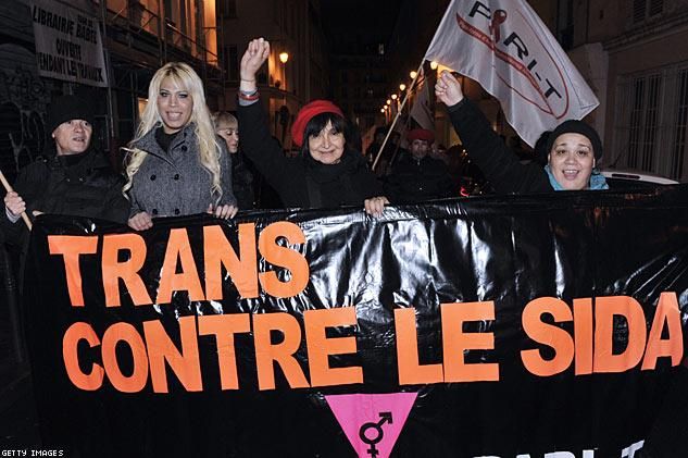 People participate in a demonstration in Paris on December 1, 2011 during World AIDS Day. According to UN figures, about 34 million people in the world were infected with HIV/AIDS in 2010 and 1.8 million people died, down from a peak of 2.2 million in 2005. Banner reads : 'Trans against AIDS.'