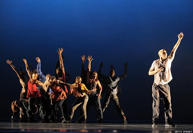 Matthew Rushing (right) and the Alvin Ailey American Dance Theater during dress rehearsal for the world premiere of Home by Rennie Harris December 1, 2011 in New York. The work, inspired by people living with HIV, premiered on December 1, World AIDS Day and the day company founder Alvin Ailey died from the disease in 1989.