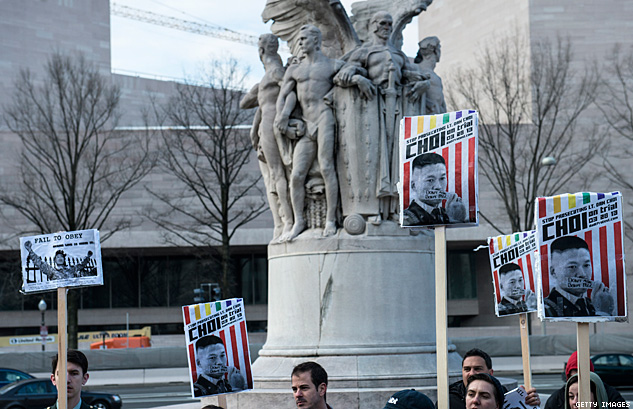 Supporters of former Lt. Dan Choi demonstrate at the E. Barrett Prettyman Federal Courthouse March 28 in Washington, D.C.