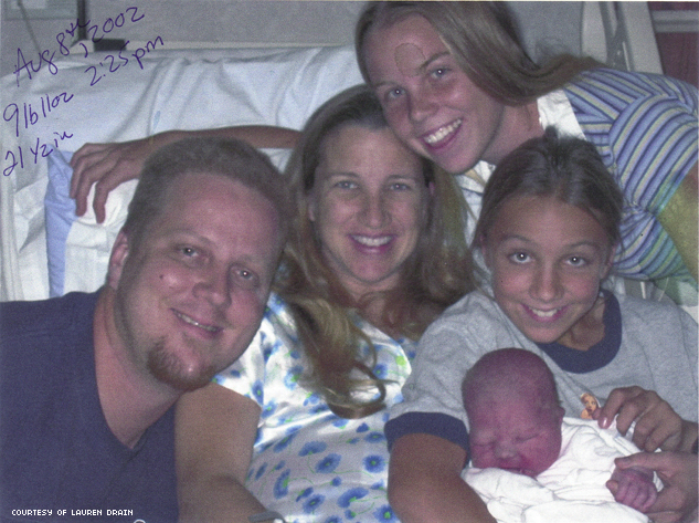 The Drain family from left to right: Steve, Lucy, Lauren, her sister Taylor, and baby brother Boaz at the hospital for Boaz's birth in August 2002. The Drains were living full-time at the Westboro compound by the time Boaz was born.