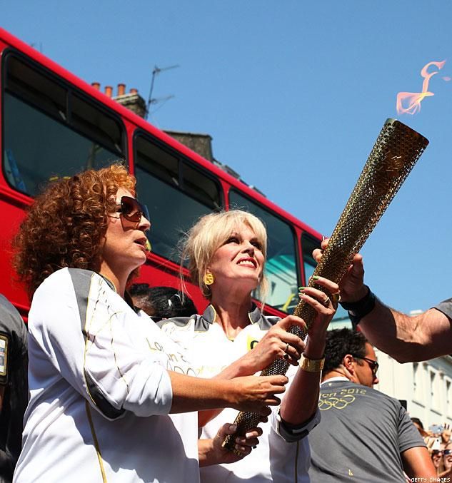 Absolutely Fabulous stars Jennifer Saunders and Joanna Lumley follow up their Olympics-themed comedy special with a real-life relay through the streets of London jointly carrying the Olympic flame.
