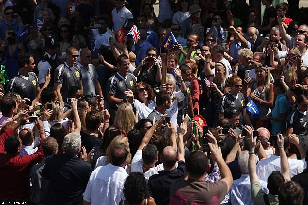 Saunders and Lumley were dressed as their beloved AbFab characters Edina and Patsy, respectively, but in the official Olympic white uniform. The pair smiled and waived to throngs of spectators lined up in London's Kensington and Chelsea neighborhoods as they briskly walked past some of the city's best-known monuments.
