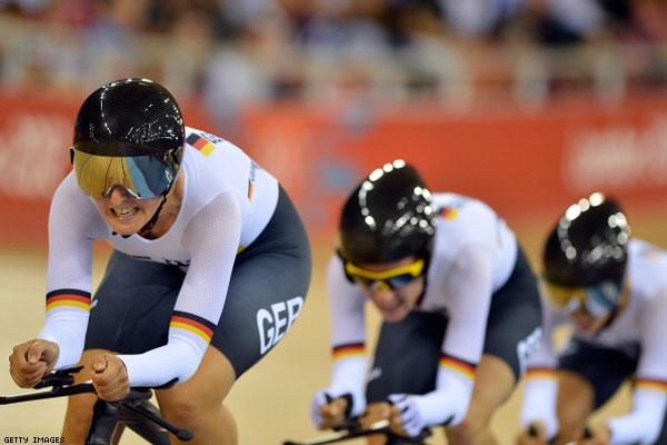 German cyclist Judith Arndt was the first out lesbian to win a medal in this, her fifth Olympic games since 1996, when she won a silver medal for the individual time trial. Arndt's German team member Ina Teutenberg was edged out by .25 seconds to place fourth in the women's road race. Together in the women's team pursuit (above, led by Arndt), Germany placed eighth.