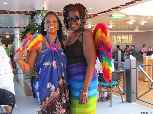 The Advocate wasn’t the only queer publication on board. Robin Lowey, founder of Epochalips, a multicontributor blog for lesbians over 40, was there too. Some of the Epochalips contributors (who include Meredith Baxter, Vicki Randle, Jewelle Gomez, Marga Gomez, and more) were also on board, including Kate Clinton. Lowey’s here with musician and producer Terri Lynn Delk from We Want the Music Company, producer of the Michigan Womyn's Music Festival.