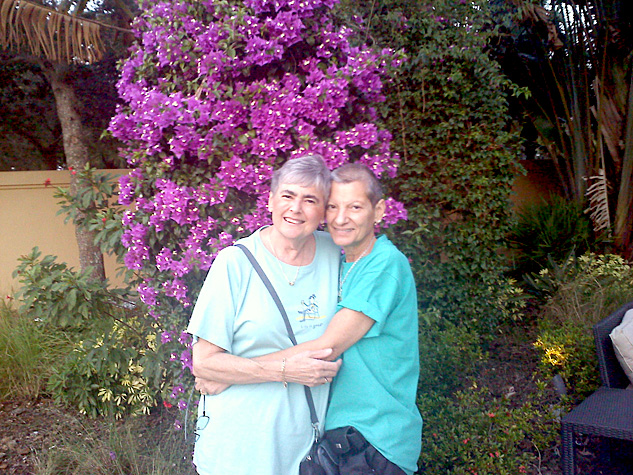 Yoli Farnum and Mary Gay Hutcherson were among 70 lesbians from Carefree Resort who traveled together on the Olivia cruise, wearing matching “Carefree Cruisers” T-shirts. “We chartered the bus and it came in the community to pick us up at the clubhouse,” says Hutcherson. “Much of the community was out to see us off and there were women lining the streets waving goodbye, but someone had to stay home with all those pets. We stopped in the Everglades at a bus stop and the driver was heard calling his wife and saying, ‘You won't believe this, but I am driving a busload of lesbians and they are very nice and they have a beautiful community.’ When we got to the port and saw our ship with the rainbow flag flying a cheer went up!” Carefree Resort is an all-lesbian community of about 500 in the winter and about 150 year-round. “Totally cool place!” adds Hutcherson.