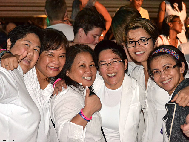 A group of gals gets down at the white party night.