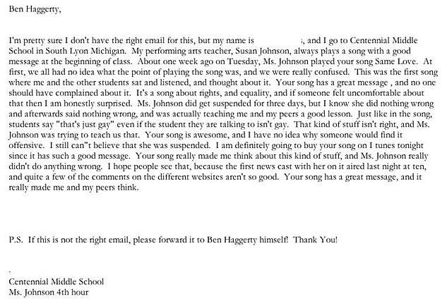 Hip-hop artist Macklemore has received a letter of appreciation from a Michigan student whose teacher was reprimanded for allowing an LGBT-supportive song by the performer to be played in her class.