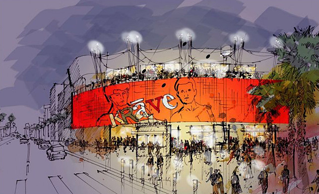 The 80,000 square foot venue will occupy a large chunk of the currently moribund Neonopolis retail center on Fremont Street. Las Vegas mayor Carolyn Goodman championed Krave Massive, seeing it as a lynchpin of downtown Las Vegas's revitalization. The new club will feature five themed dance rooms, video walls, "high output CO2 blasts," three separate bars, a martini lounge, a VIP room, a gay comedy club, a performing arts theater, a retail store, a multi-purpose room, a dance lounge for lesbians, and Guest House theaters, "the country's only LGBT movie theater," which will feature gay-themed movies from Guest House films.