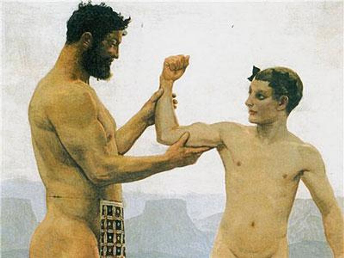 Adherents of the movement claimed that only through the confident and shameless exposure of strong, beautiful, male bodies, would young German men throw off the enervating effects of modern life and return to their natural vitality. The emphasis on male nudity had a simple rationale: not only had modern life ostensibly put the German ideal of "manliness" under pressure -- a dynamic that would have tragic repercussions with the rise of the Nazis -- but since the erotic dimension of female nudity was widely acknowledged, male nudity was paradoxically framed as inherently purer and untainted by eros, as an image of German manhood and its strength and power without any admixture of desire.