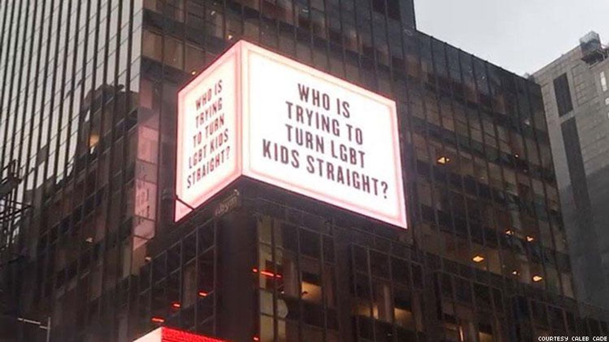 "Who is trying to turn LGBT kids straight?" one message reads on the Times Square building at Broadway and 43rd Street, followed by one saying "The Alliance Defending Freedom" and directing viewers to the website for No Gays Allowed, which details ADF's support for practitioners of the discredited and harmful therapy.