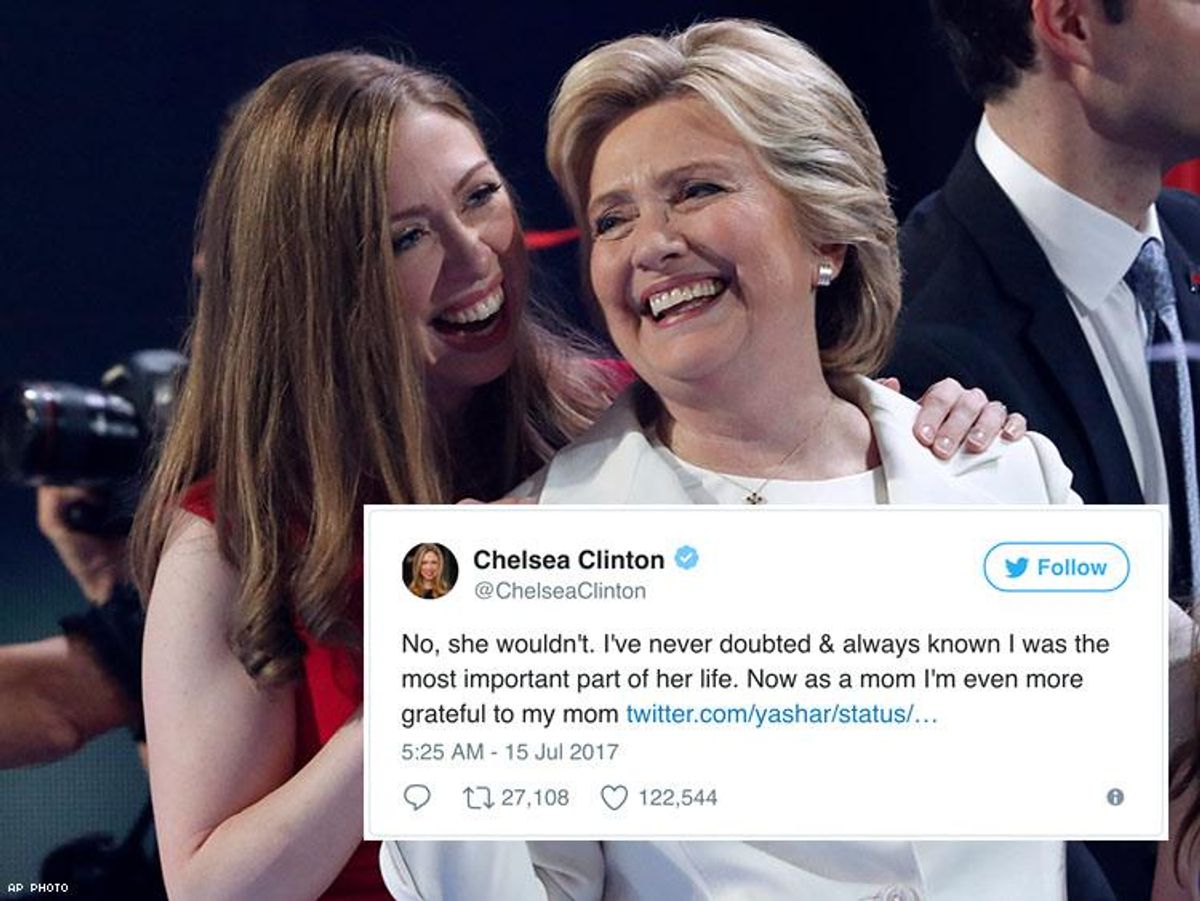 \u201cNo, she wouldn't. I've never doubted & always known I was the most important part of her life. Now as a mom I'm even more grateful to my mom https://t.co/IZE4ZSUVOs\u201d— Chelsea Clinton (@Chelsea Clinton) 1500121506