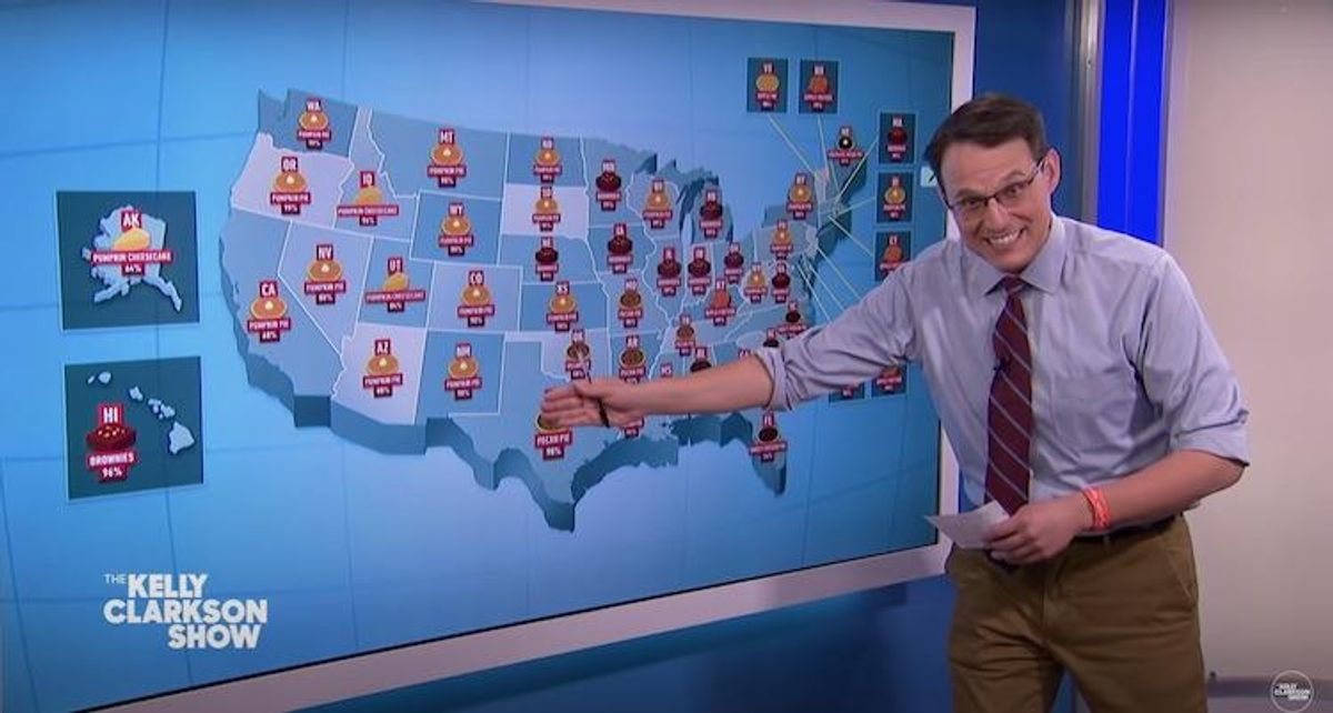 Clarkson then read a few of the milder thirst tweets about him. Finally, she asked him where he goes when he's not breaking down the Electoral College results of an election. That's when he playfully began to track the most popular Thanksgiving desserts by state.