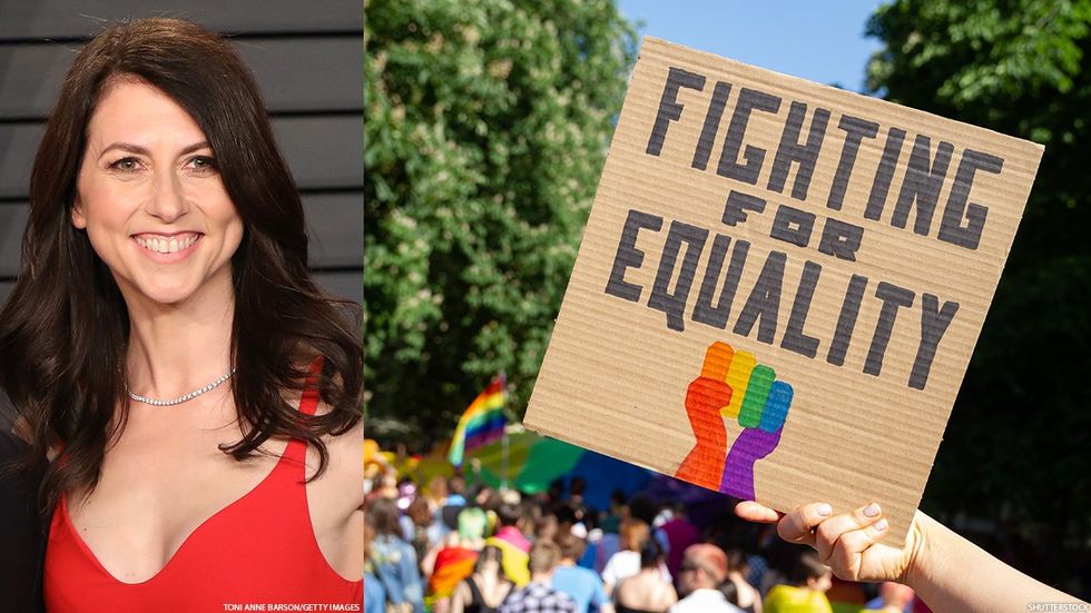 Pictured: MacKenzie Scott and an LGBTQ+ rights demonstrator