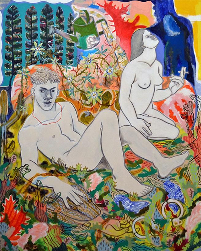 Born in Guatemala, Black Peter has not only made New York his home, but also has become a quintessentially New York artist, and a visible — sometimes naked — icon of the downtown scene. His work is luscious and tropical, not quite what you would first associate with the Big Apple. But his posturing Latino boys loosely painted over NYC subway maps are so New York.