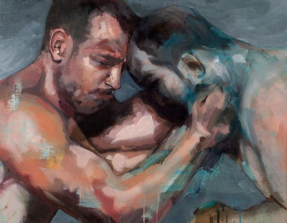 Andrew Moncrief’s exhibit “A Strange Feeling,” which recently opened at the Utah Museum of Contemporary Art, finds the narrow boundary between sportsmanship and sexuality. His large-scale canvases are layered in brush strokes as muscular and energetic as the wrestlers he depicts.