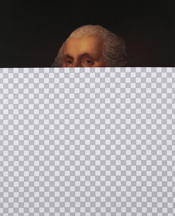 Above: Nothing Rhymes With Orange (George Washington, White House Art Collection Erasure No. 5), 2018, acrylic/canvas, 32 x 26 in