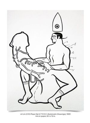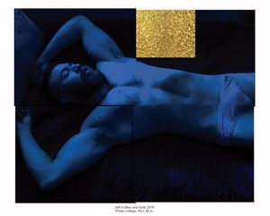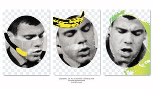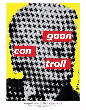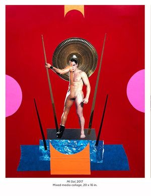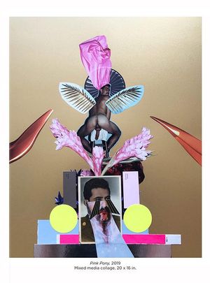 Digital Flux, series, 2015-18, and the clever 2019 protest portrait of POTUS - Goon, Con, Troll - are harvested from a collection of objet trouve internet images. Esparza downloads the pictures and manipulates them with dot matrixes and grids. Sometimes he paints semen and swashes of Warholian colors onto the faces of his subjects as an extension of his print photomontages. Hand-cut and pasted-up porn magazine pages graphically homoeroticize whimsical adorations of the penis. These analog collages form the underpinning to his digital pastiches that employ complex computer manipulations to create an inventive layering. Coded into these handmade amalgamations is a commentary heralded by a blast of hard-core queer smut from another time; together they retrieve a culture vanquished by the internet age. Esparza revivifies print porn as he creates outrageously sexual erotica that gives homage to a vanished genre of gay civilization.
