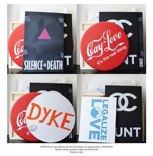 GLoves (Blood Drive), a 1995 triptych, epitomizes many themes of Esparza's oeuvre. The artist, culturally imprinted by a Latinx heritage, moved to Los Angeles from Houston, after his lover died of AIDS. To memorialize the death and cope with grief, Esparza secured a phlebotomist and invited friends to donate blood that he then dripped onto brightly hued latex gloves. Uniting the conceptual with the visual makes for an arresting, colorful overlay to a disturbing piece of activist art, swirling sadness and AIDS anger together in the same mixed-media piece.