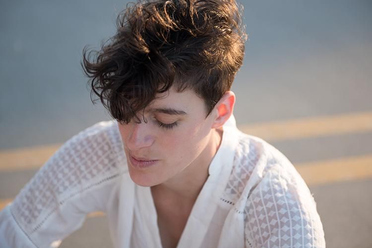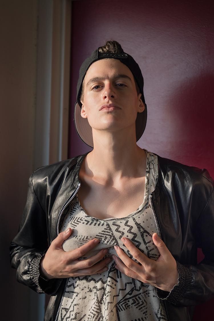 Rain Dove, the 6-foot 2-inch androgynous model, walks into The Advocate's offices in Los Angeles wearing an In-N-Out white paper hat, denim jeans, high-top sneakers, a pink printed button-up shirt, and a designer leather jacket that was given to her by designer Loris Diran when she walked in his show back in July for Men's New York Fashion Week.