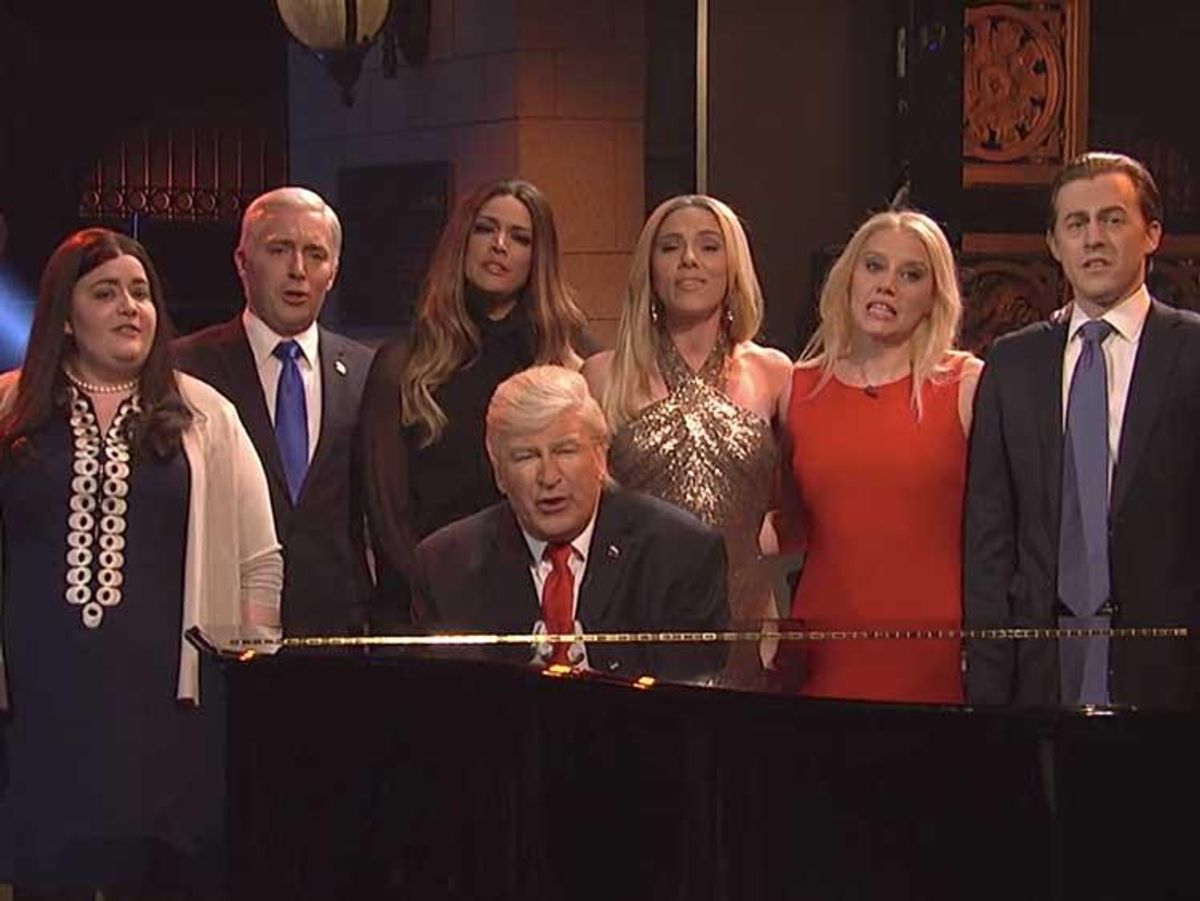 For this week's cold open, SNL flipped the script on "Hallelujah" turning it into a sad parody for what has felt like the end of Donald Trump's ill-begotten presidency these past few weeks. Stepping into the tangerine cotton candy wig he's worn since last fall to portray the man who sits in the Oval Office, Alec Baldwin began the number solo at the piano. Soon, Kate McKinnon's Kellyanne Conway, another searing impression of the season, joined him. Quickly, those who gained from hitching their wagon to Trump and those who stand to lose from any imminent Trump downfall, began to filter onto the stage and sing, including Beck Bennett as Mike Pence, Mikey Day and Alex Moffat as the Trump sons Donald Jr. and Eric, Aidy Bryant as Sarah Huckabee Sanders and the grim reaper as Steve Bannon. Finally, Cecily Strong strolled in as Melania Trump, with a surprise appearance by Scarlett Johansson as the "Complicit" Ivanka Trump at her side. It was fun to recall the actors who've delivered fantastic impressions throughout SNL's renaissance season, but the image of Trump flanked by his sycophants also illustrated how easily the dominoes could fall.