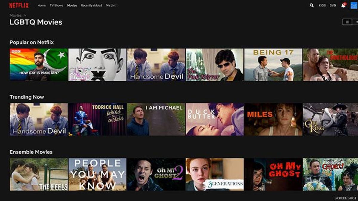 There are 42 queer films on Netflix UK, reports Gay Star News; the Twitter user who complained is British. In the collection, 24 films centered on gay men, 10 on lesbians, and four included bisexuals. Only one featured a trans woman, but she was in a minor role.