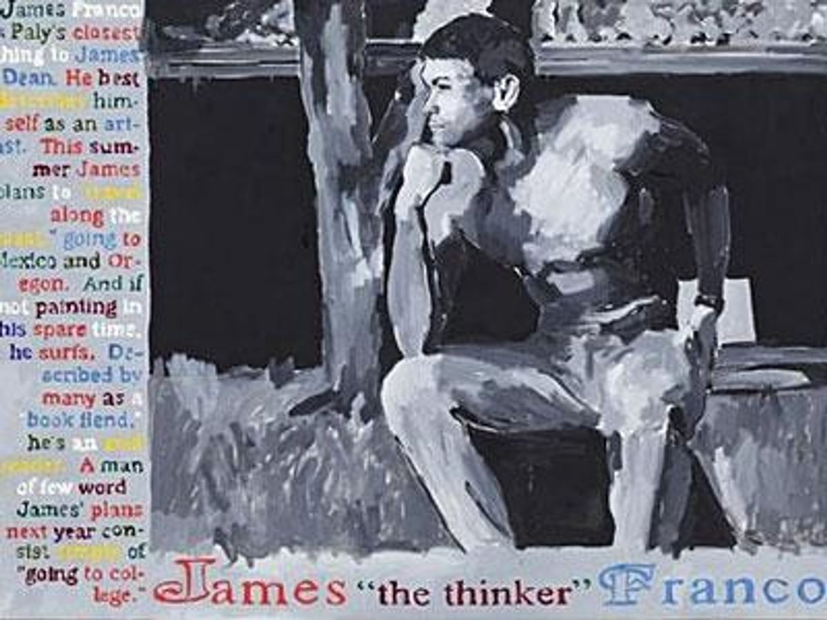 All hail James Franco, the actor-artist-activist-student slash patron saint of all things gay. The actor, who appears in next month's much-anticipated Wizard of Oz prequel, Oz: The Great and Powerful, stopped by Jimmy Kimmel Live last week to talk about his latest art exhibit at Berlin's Peres Projects, called "Gay Town." Among the choice pieces of art he showed off to Kimmel: A painting of his high school's (nearly nude) water polo team, which he admits he wasn't a part of but he "wished" he was, and another self-portrait, in which he's shirtless and in the classic thinking man pose.