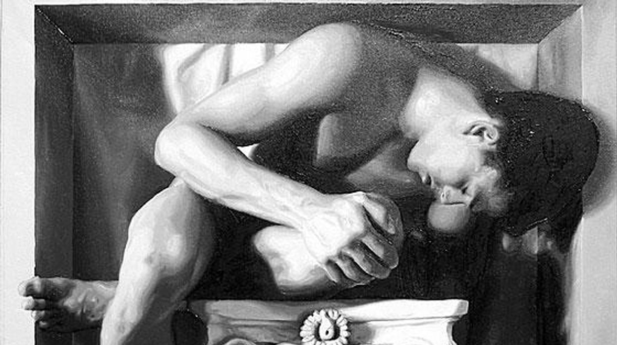 The box became a tool to force organization into my figures. My first work of this series was donated to the Leslie/Lohman foundation of New York, created in 2004. I was inspired by the work I saw in the Louvre, and sculptures placed in niches throughout the building. I liked how the hard lines of the alcove contrasted with the soft flesh of the sculptures placed within them. I thought too, my work would read as both painting and relief sculpture. The boxes allow me to compose my exhibitions. The meanings of the works can change based on their proximity to neighboring works. If a sleeping figure is next to one playing music, one may assume the sleeping figure has been lulled by a song to slumber... however if paired with a crying figure, the sleeping man may appear to be dead. The works are intended to be on their own, but I like the additional nuances that can be achieved through composition.
