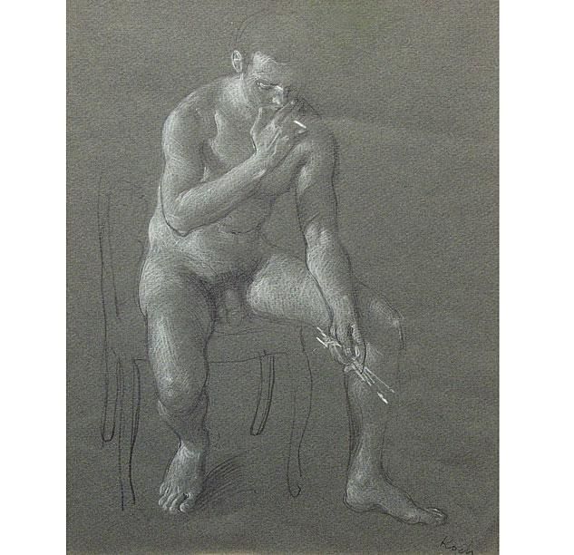 The Sculptor, 1964. Perhaps the most revelatory of Koch's self-portraits. It almost dares you to make a conclusion. From the stance of the model, to the gesture of the cigarette, intimacy steams from the canvas. Then there is the detail (see next page) of the posing strap string, delicately resting on the upper curve of the model's buttocks. And what about the calipers?