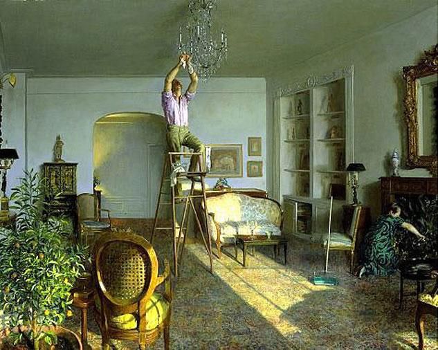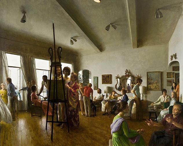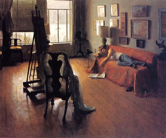 Koch's style would have been referred to as realistic, but his realism was tinged with the blurry fantasy of Park Avenue Bohemia. This is society as it would like to see itself. Contemplative and arty with fine Chinese antiques and sumptuous drapes. Now that the heat of Abstract Impressionism is off, the work has an elegant bittersweet feel.
