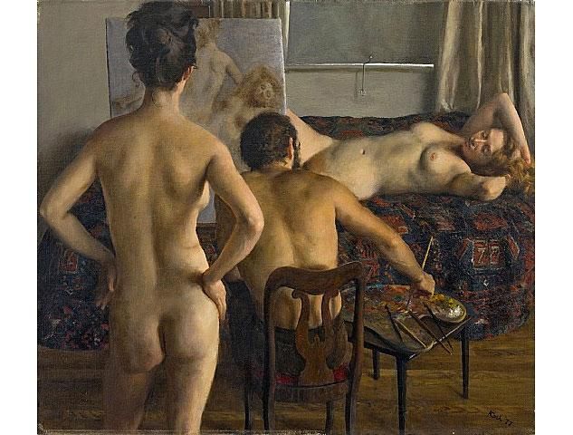 And then there are his paintings of nudes -- sometimes languorous and erotic, where the artist's eye is the fourth unseen wall. Others are staged self portraits of Koch as the artist with models appearing more naked than they would have for the presence of his fully dressed and distracted figure along side them.
