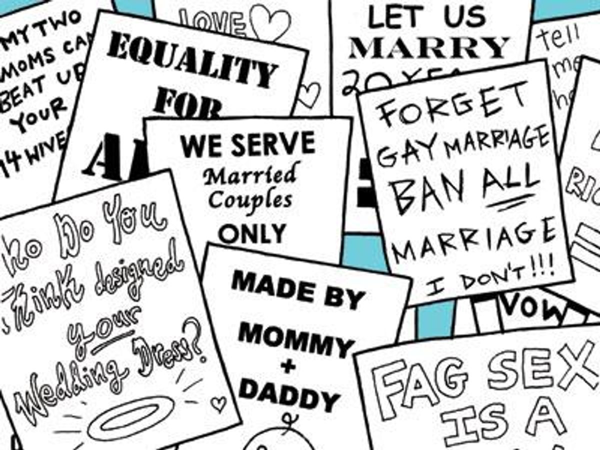 A girl with spiky hair, holding a pamphlet, came up to Adam. "Hey, you want a copy of our statement? We're Queers Against Gay Marriage."