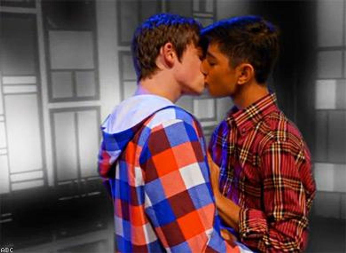 The kiss takes place backstage after the curtain drops on Justin's school play. In the show Justin kisses his leading lady, and his male costar is just a little bit jealous.