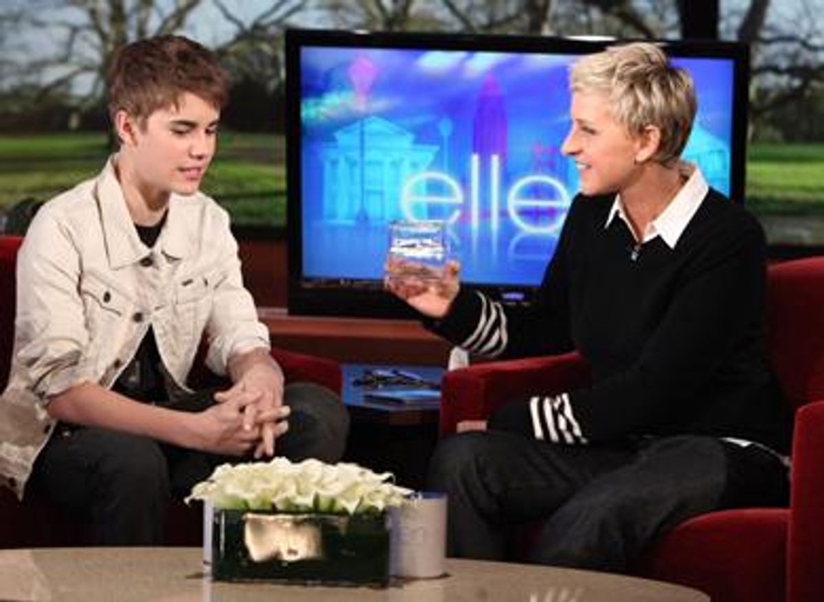 Bieber joined Ellen for the Twits and Ask segment during her monologue. He confirmed that she would appear in his Never Say Never 2.0 version, and gave her a lock of his real hair. Ellen said she would auction off the hair to benefit an animal charity.