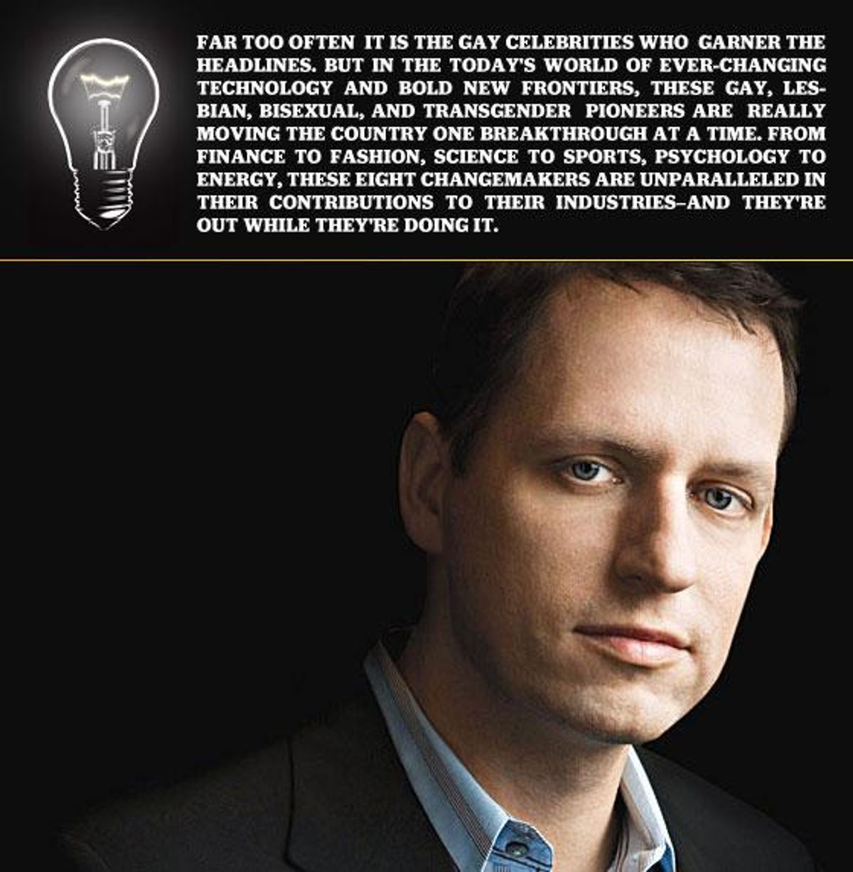 While the recent recession sent the value of Clarium Capital's portfolio dropping significantly from its peak, Thiel is always in demand. He's shared insight with Facebook CEO Mark Zuckerberg on occasion, and even with gay business groups that invite him to speak, though the gay innovator admits he lacks any LGBT-specific advice.When it comes to business, he says, "you learn it by doing it. And if people have great ideas, they should do it whenever they have it. I don't think there is anything about people having to be young or old." Or, apparently, gay or straight. --Lucas Grindley
