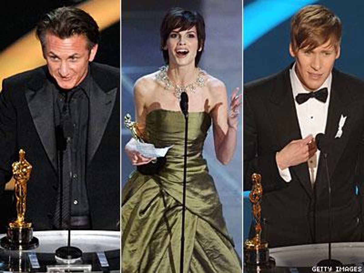 "You commie, homo-loving sons of guns," Penn began as he accepted his second Best Actor Oscar in a speech far more memorable than his first. Penn was damning of Proposition 8 supporters -- "I think that it is a good time for those who voted for the ban against gay marriage to sit, and reflect, and anticipate their great shame, and the shame in their grandchildren's eyes if they continue that way of support," he warned. He added simply, "We've got to have equal rights for everyone." Penn's speech was strangely touching in its aggressiveness, and it wasn't the only win for the Harvey Milk biopic that night.