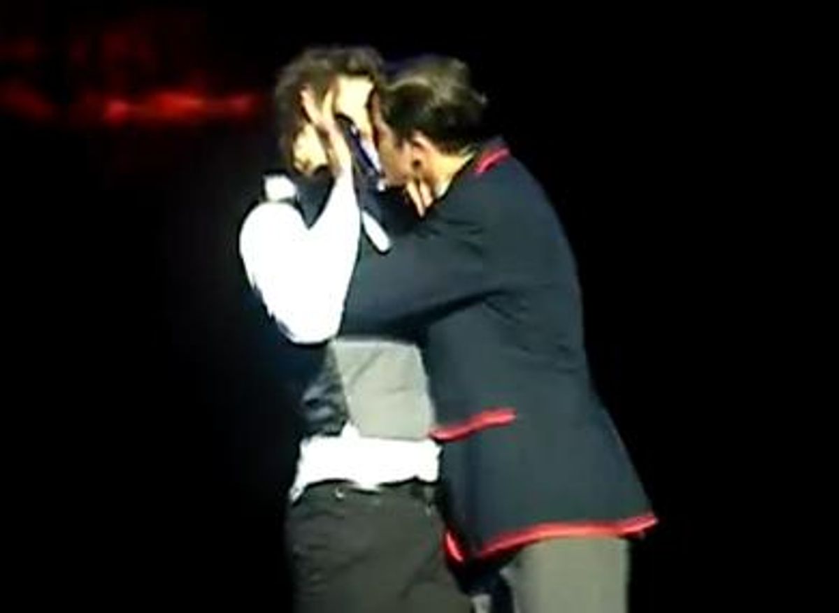The kisses "stopped the show" in Dublin and became a trending topic on Twitter, Just Jared reports. Watch the video here.