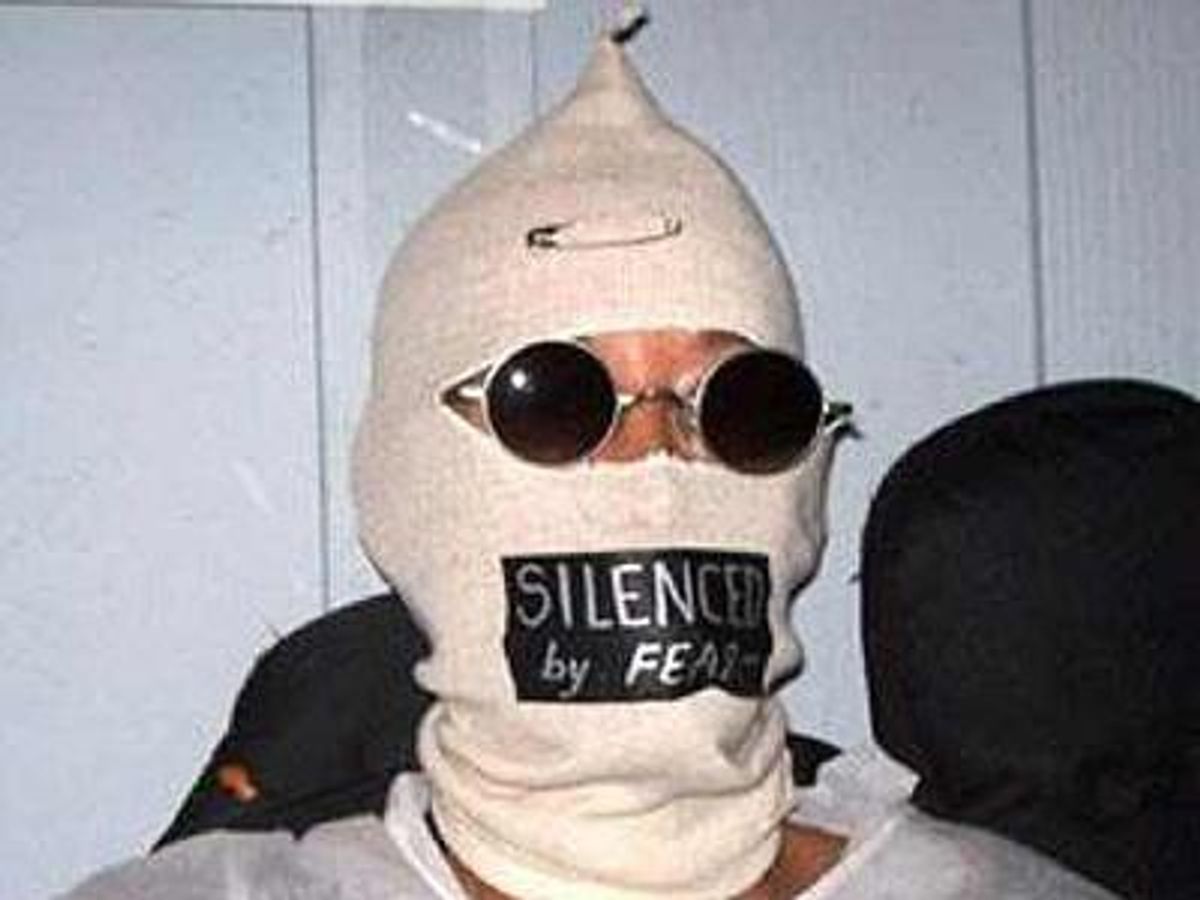 Michelle Shocked continues to, well, shock her former fans and supporters. Earlier this week Shocked appeared outside Moe's Alley in Santa Cruz, Calif., according to David Badash at The New Civil Rights Movment, wearing a creepy full-body costume that included duct tape across her mouth with the words "Silenced by Fear" scrawled across it. The venue was one that had canceled a Shocked concert after she stunned audiences at the San Francisco Bay area jazz club Yoshi's by telling her audience that marriage equality would doom us all and that it was fine to tweet, "Michelle Shocked says God hates fags."