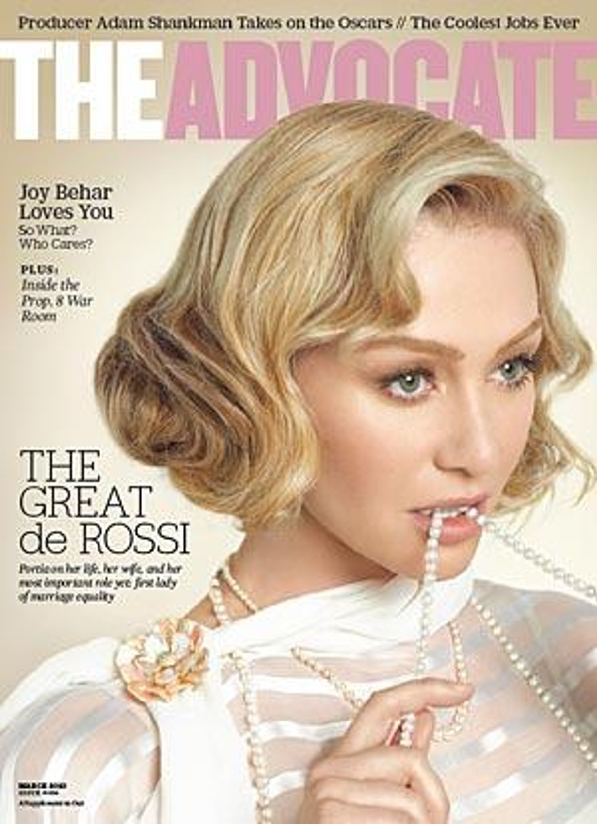 Whenever anyone asks De Rossi about marriage equality--and, grateful for whatever "little tiny platform" she's given, she hopes they will--she reveals herself to be an impeccably prepared spokeswoman, a perfectly poised first lady of advocacy. Further proof will come in March when the Human Rights Campaign will acknowledge De Rossi with its Visibility Award at a ceremony in Los Angeles.