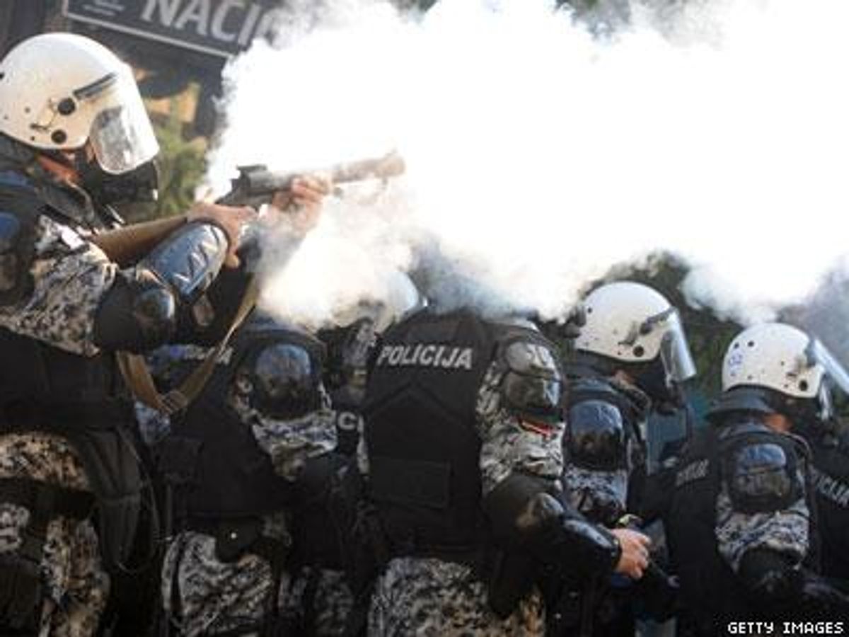 A Montenegrin policeman fires tear gas to disperse protesters during Montenegro gay pride parade.