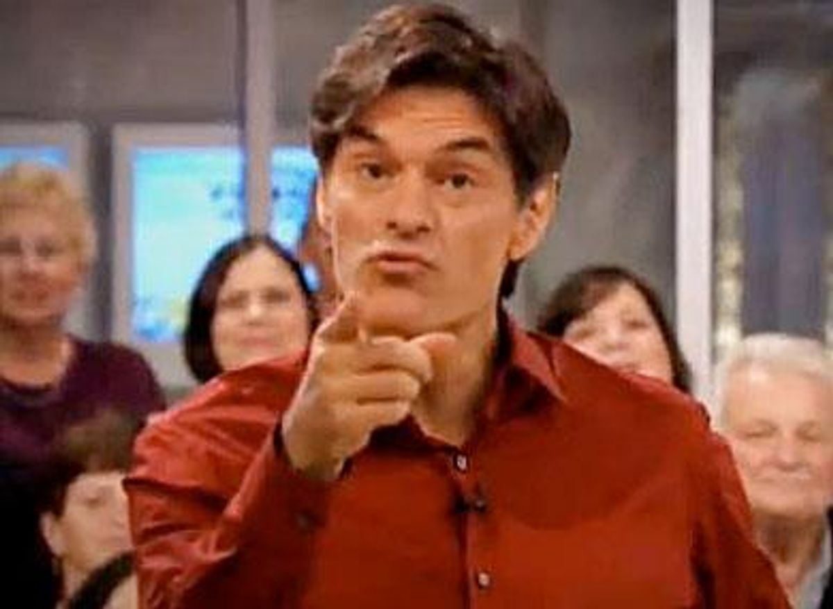It's like they just put Oprah's entire audience on a shuttle bus and dropped them off down the block at Dr. Oz's place. And because Dr. Oz knew they were coming he just fixed up his content to suit them. I mean, I guess it suits me too because I've been watching Oprah and Martha and Ellen and Tyra and whoever else all this time without thinking much about the way none of them were really aimed at me. I just felt kind of smarter knowing all that stuff about menopause. And now, thanks to Tyra's "period panties" show last week, I also know all about tampon applicators and who needs which kind.