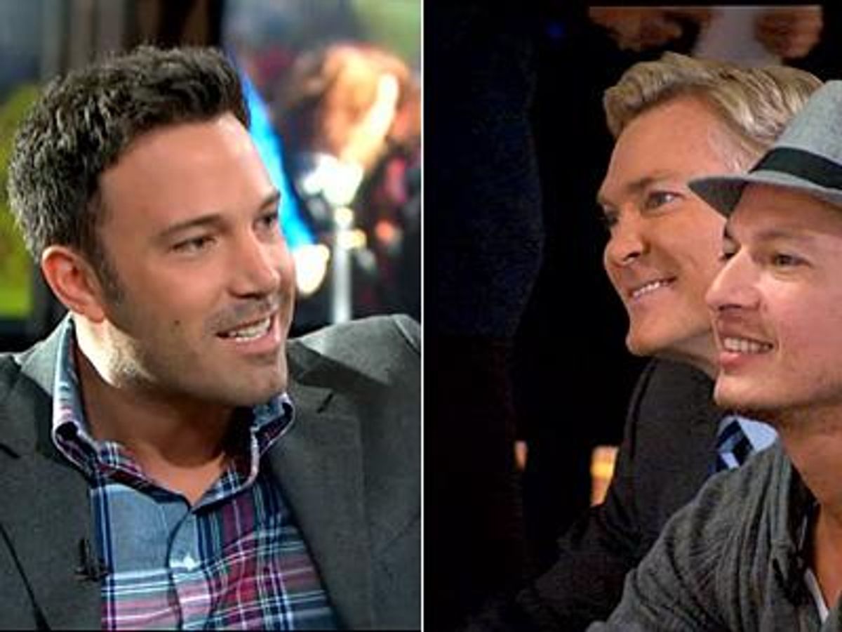 Actor and director Ben Affleck appeared on Good Morning America Monday to promote his new film, Argo, but also congratulated the show's weather anchor, Sam Champion, on his recent engagement to his partner, Rubem Robierb.