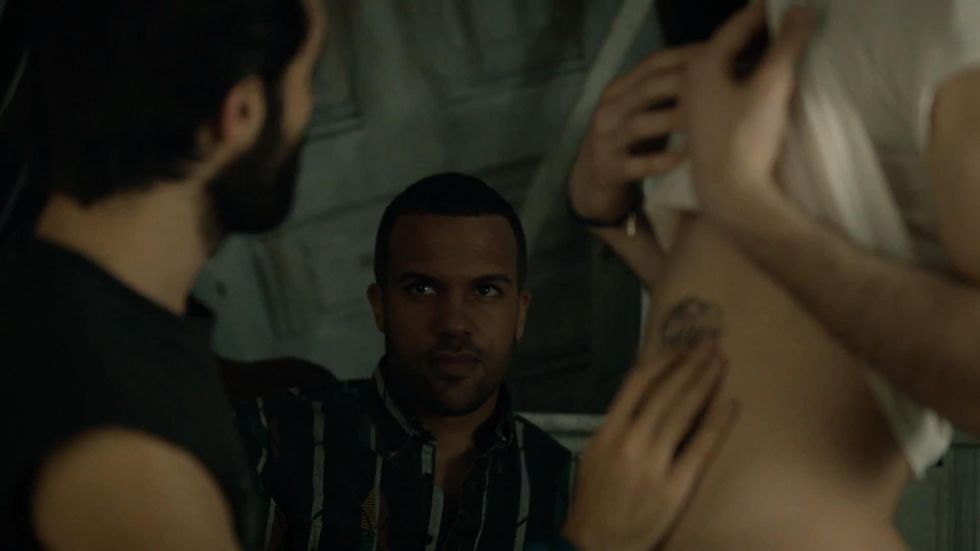 Perhaps the most titillating moment of the premiere, the clear declaration of "Toto, I don't think we're in Will & Grace anymore," Agustin and his soon-to-be-cohabitating boyfriend Frank (O. T. Fagbenle) decide three is the magic number when they meet Scotty. They chat for a bit in front of the odd chair sculpture before Scotty shows off his new tattoo - Dolly Parton's signature - and Agustin moves in for a closer look. After he and Frank share a glance, he dives right in for a kiss. Interestingly, Frank later hints that he might not be the threesome type as the two settle into their domesticity together, putting this development squarely above pure shock value and firmly in the bin of intriguing story developments.