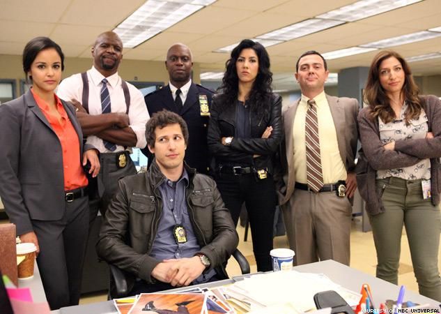 The men and women of the Nine-Nine (from left): Melissa Fumero as Det. Amy Santiago, Terry Crews as Sgt. Terry Jeffords, Andy Samberg as Det. Jake Peralta, Andre Braugher as Det. Ray Holt, Stephanie Beatriz as Det. Rosa Diaz, Joe Lo Truglio as Det. Charles Boyle, Chelsea Peretti as Gina Linetti