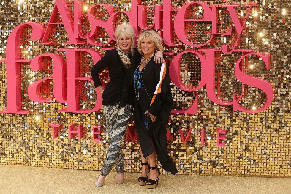 Joanna Lumley, in character as Patsy Stone and Jennifer Saunders, in character as Edina Monsoon attend the World premiere of "Absolutely Fabulous" at Odeon Leicester Square on June 29, 2016 in London, England