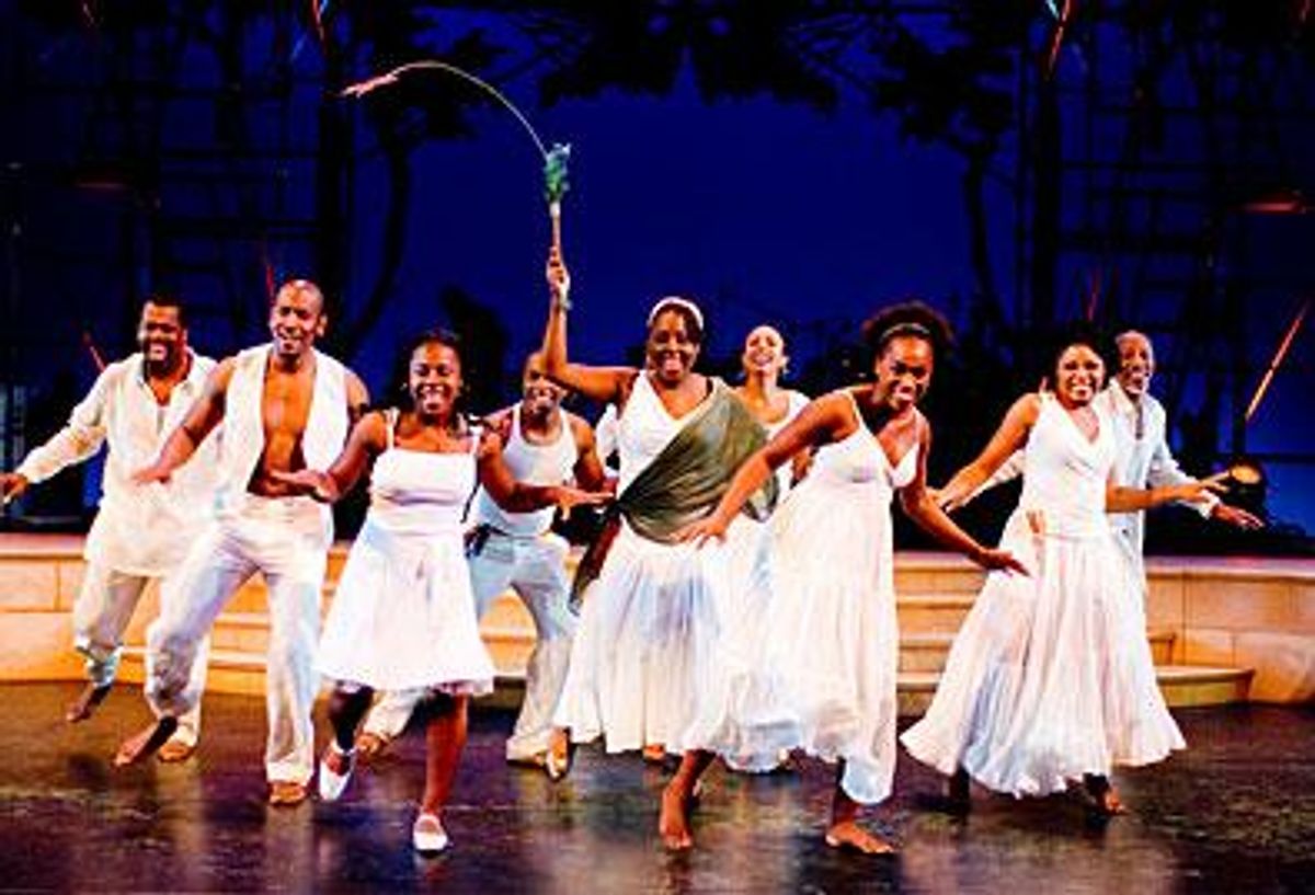 Choreographer Bradley Rapier, whose bio is all about hip-hop, unleashes wind and rain as well as a gumbo of seductive African-flavored dances. The ensemble is so good, so rounded, that every sung moment is a pleasure and every dance moment shines. And the scaled-down Reprise production actually helps the original show: Instead of the multicolored motley worn by the original cast, these actors are all in simple white cotton. Faces and bodies get the attention they deserve.